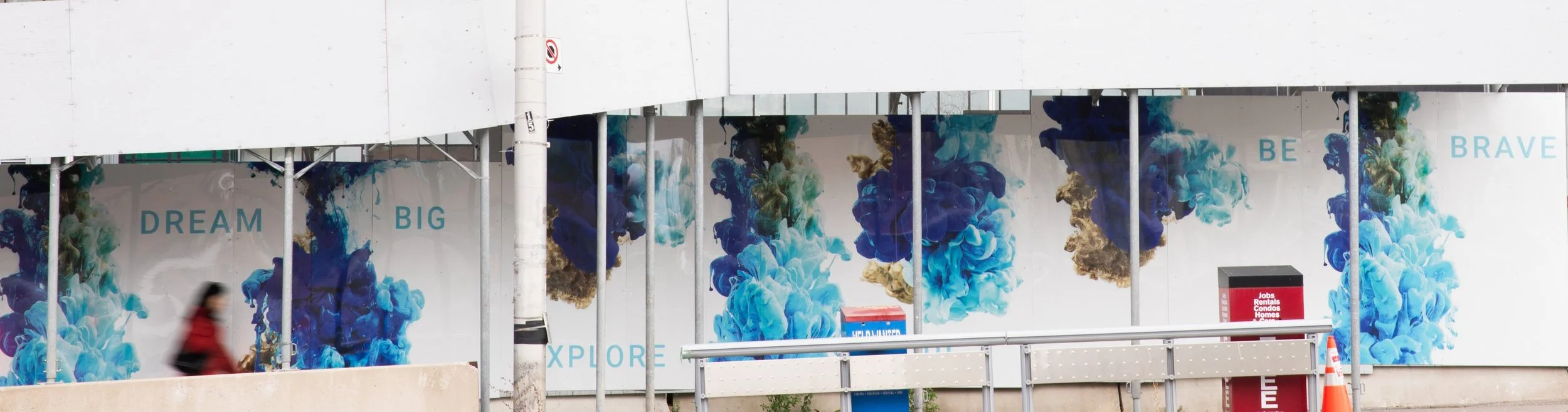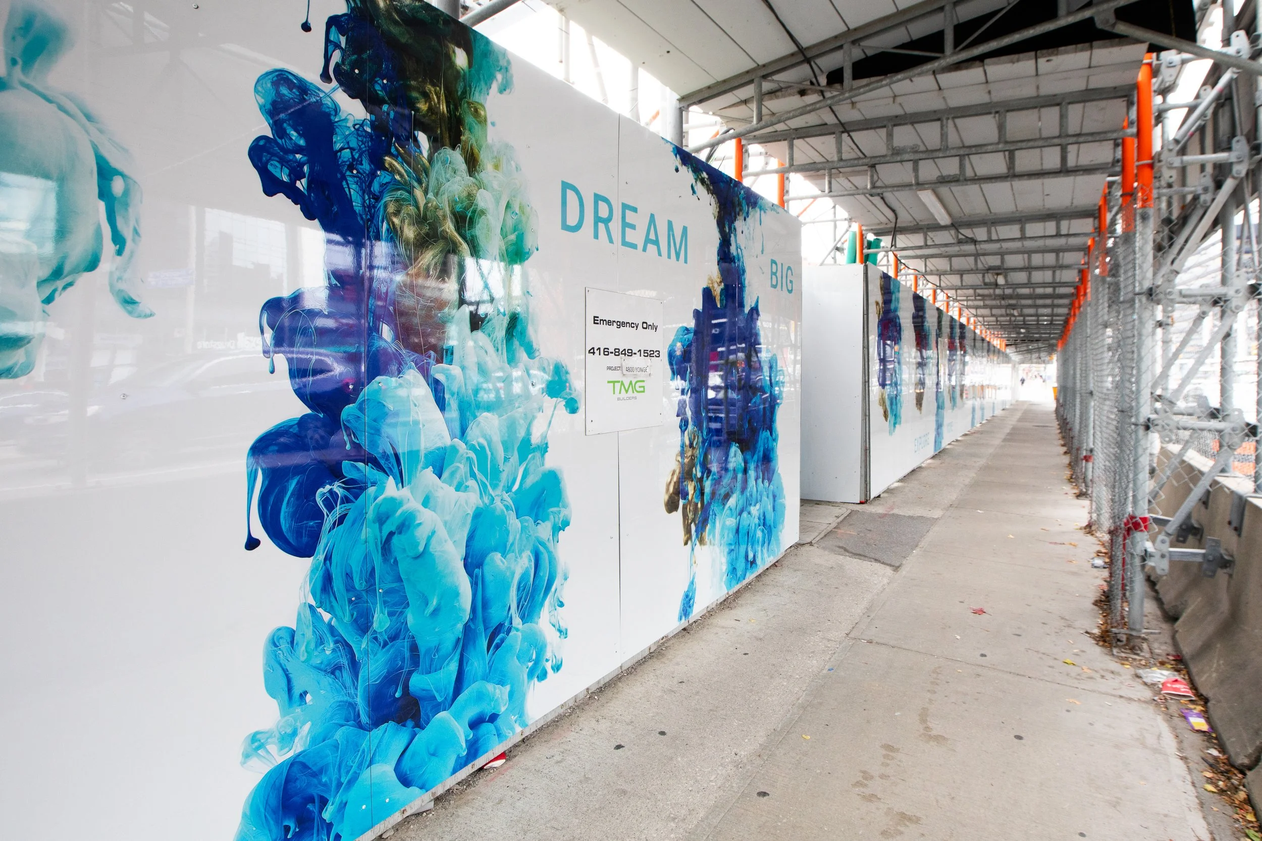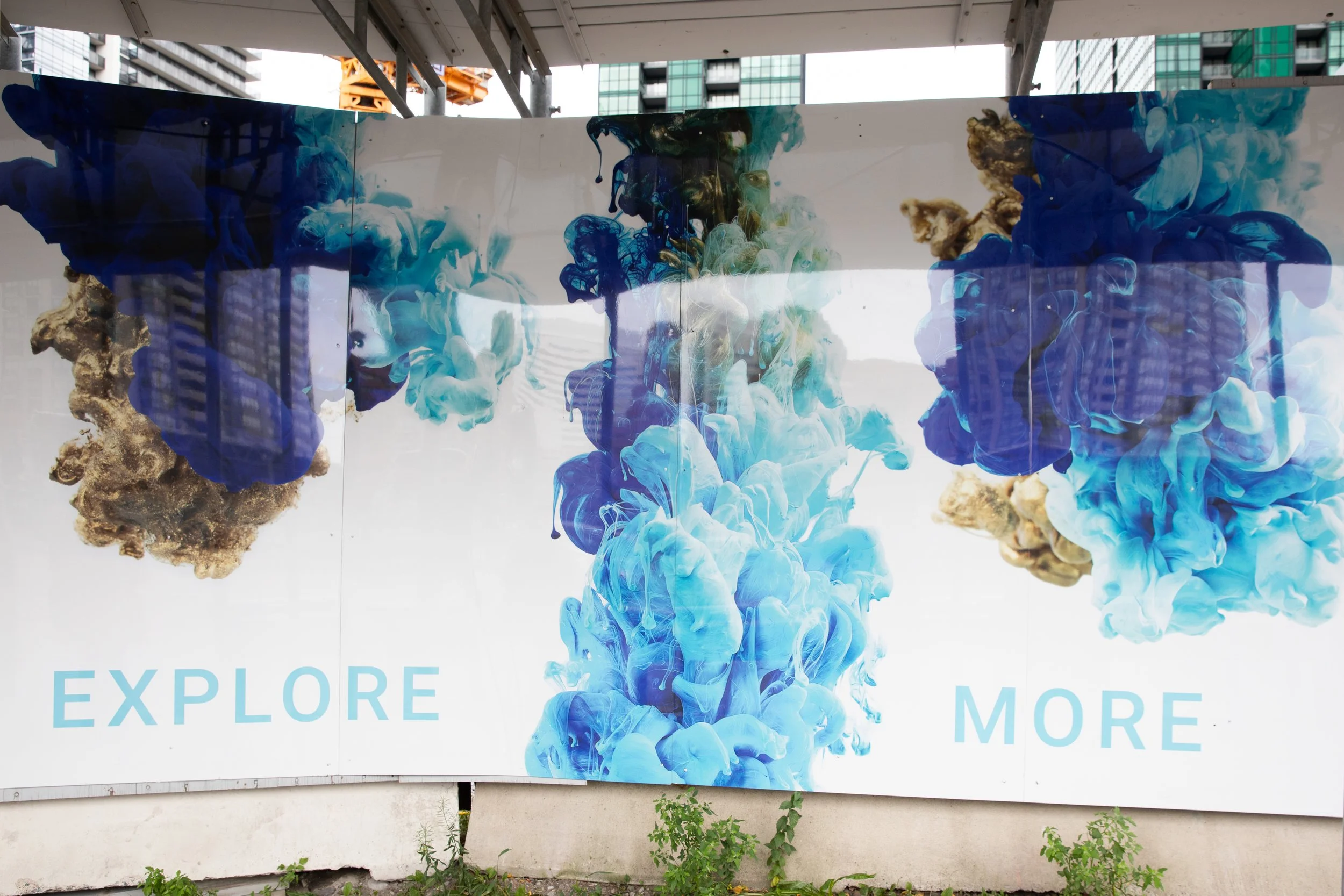 This piece showcases suspended paint in motion, paired with uplifting phrases. The abstract shapes comprised of blues and golds, and the uplifting phrases throughout the art invite viewers to pause and reflect. It offers a break from the busyness of everyday life. It is approximately 2500 ft of art displayed on the corner of the Yonge & Sheppard in Toronto, Canada .